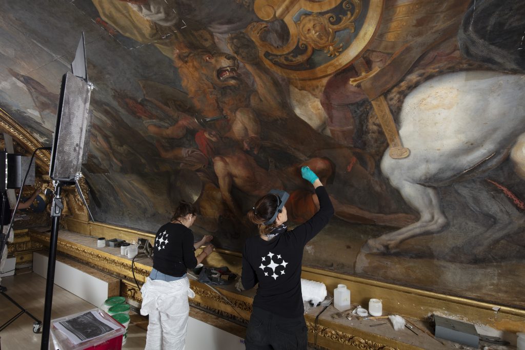 La voûte du salon a été consolidée par le haut. Les vernis épais et jaunes, oxydés et encrassés, avaient ainsi opacifié les œuvres, qui ont retrouvé leurs couleurs d’antan grâce au travail des conservateurs-restaurateurs. Les surfaces présentaient des soulèvements et des lacunes et de larges repeints dus à des restaurations antérieures étaient discordants. Les stucs et dorures, qui étaient encrassés et présentaient quelques dégradations, ont également été restaurés.