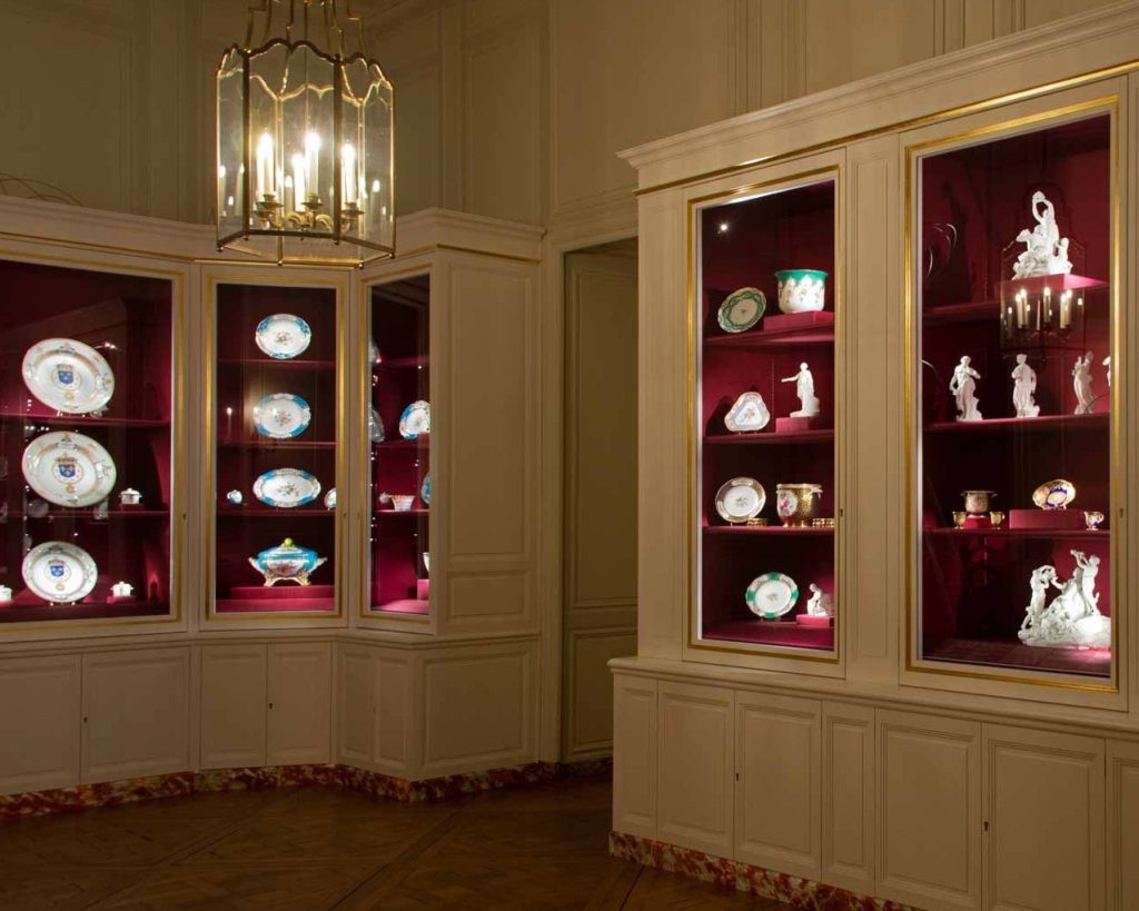Installé dans le cabinet des porcelaines, cet objet exceptionnel trouve un écrin à la hauteur de sa finesse. Cet espace, intime et soigneusement agencé, permet de mettre en valeur la richesse et la diversité des productions des manufactures royales. Le porte-huilier y est présenté dans un contexte qui évoque à la fois l’usage quotidien et le cérémonial de la cour, offrant aux visiteurs une lecture sensible et détaillée de l’art de la table à Versailles et du savoir-faire des ateliers de Sèvres.