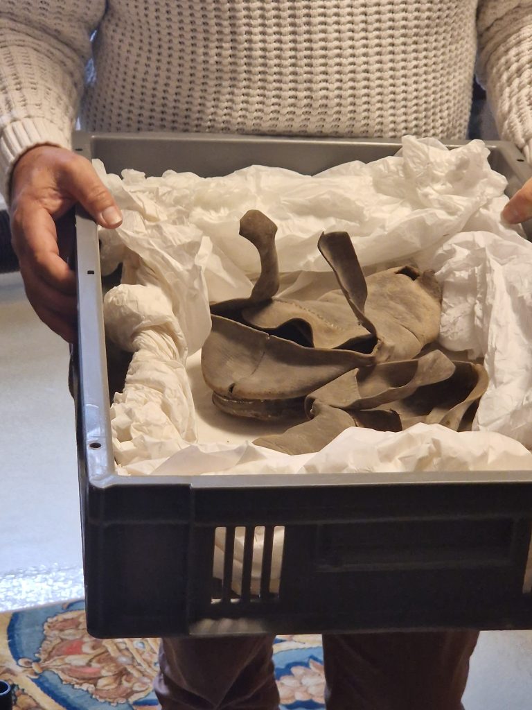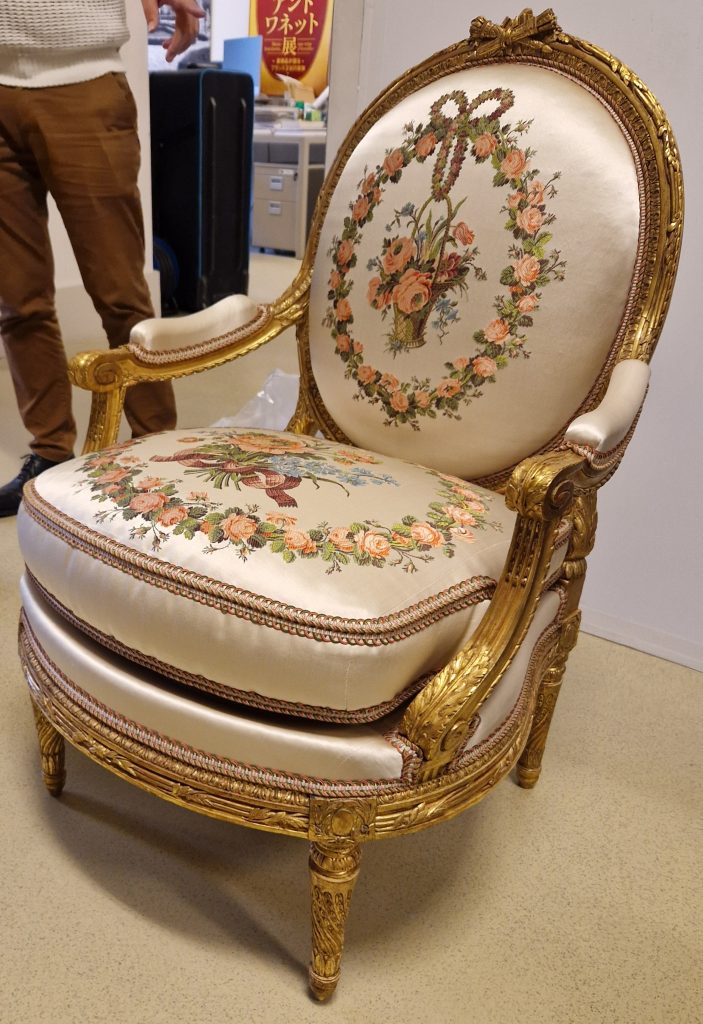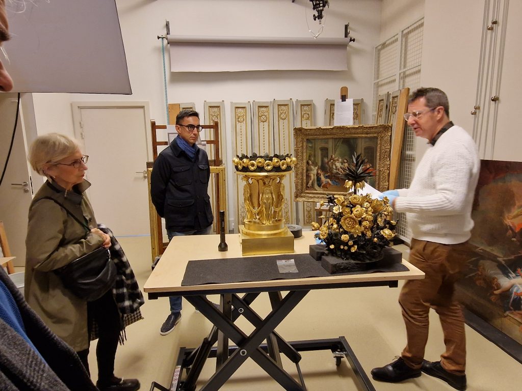 Monsieur Christophe Fouin, chef de travaux d’art au Ministère de la Culture et en poste à la conservation, nous a dévoilé quelques trésors en attente de photographie : un fauteuil du comte d’Artois tout juste sorti de l’atelier du tapissier et destiné à l’appartement de Madame Du Barry ; la merveilleuse pendule du salon des glaces du Grand Trianon qui nous manque cruellement ; comble de l’émotion, une paire de chaussures nichée sous le parquet des sacristies de la chapelle royale, révélée à la faveur de la restauration initiée par les Amis de Versailles. Ce sont quelques-uns des objets qui nous ont été présentés pour notre plus grand plaisir. Ils seront photographiés sous tous les angles pour les archives et pourront ainsi figurer dans l’ensemble des publications de l’établissement.