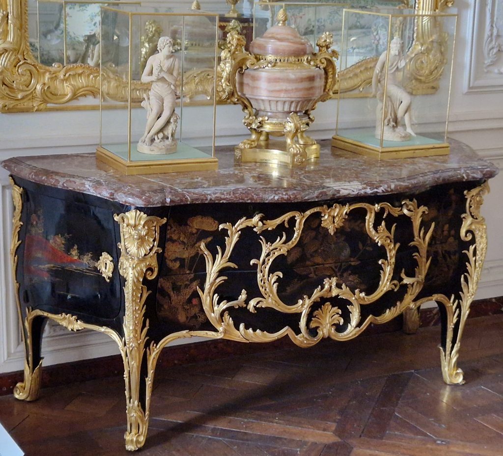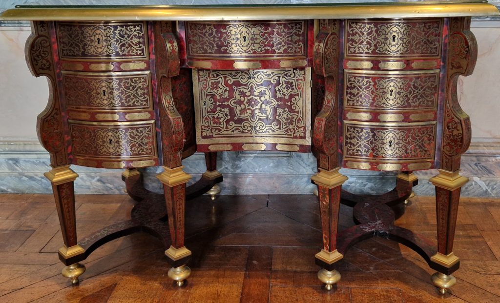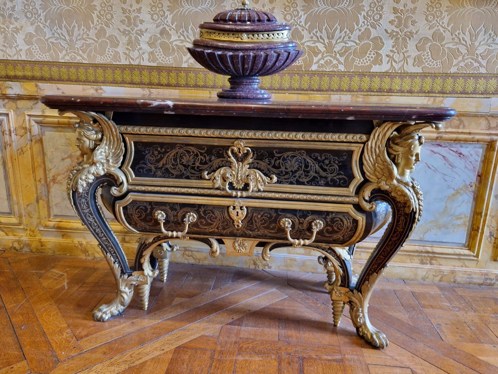 Quelques salles plus loin, nous nous sommes arrêtés devant deux commodes Boulle commandées pour le roi au grand Trianon, à pieds en toupie et pattes de lion. C’est l’abondance qui caractérisait le style Louis XIV.