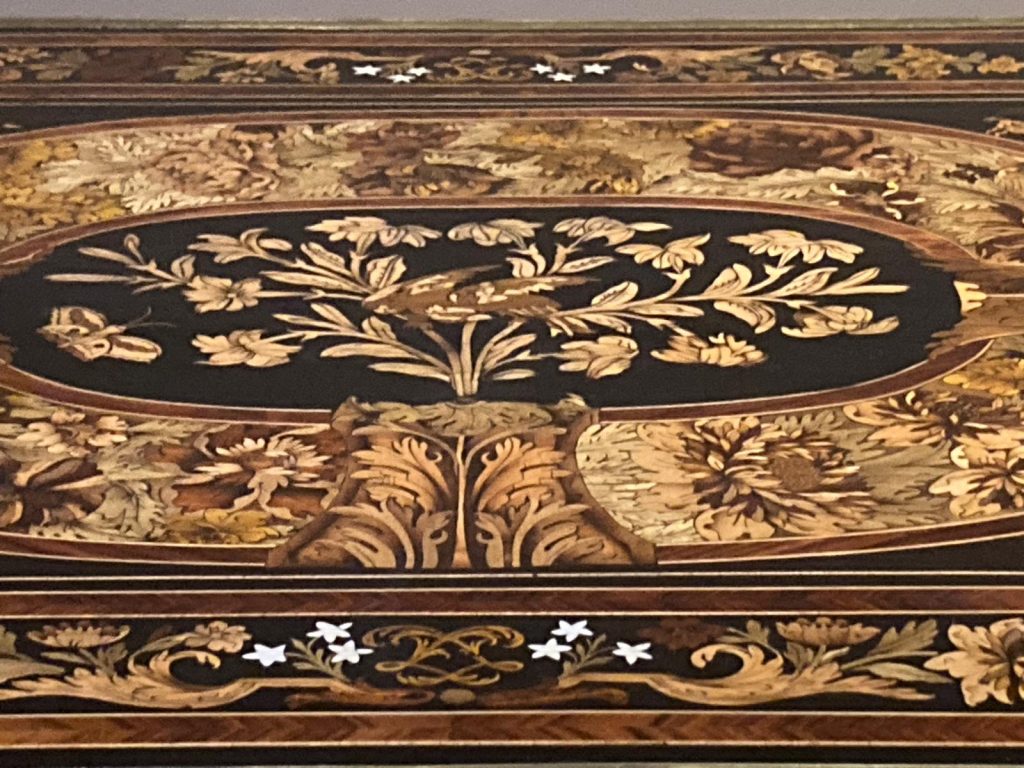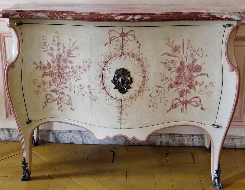 Nos pas nous ont ensuite menés à travers le Grand Appartement jusqu’aux Petits Appartements. Tout en cheminant dans un calme appréciable, nous avons revu les merveilles exposées dans ces somptueuses salles où Riesner ainsi que son maître Oeben se sont distingués : commode, bureau à cylindre nous ont révélé la précision de l’ajustage des pièces en bois. Un passage par l’appartement de Madame du Barry nous a présenté un autre travail : l’utilisation de plaques de vernis martin avec cette très jolie commode en laque blanche, ou de plaques de porcelaine de Sèvres.
