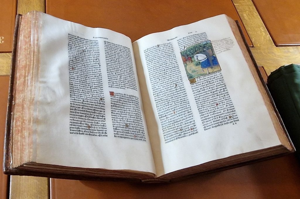 La visite s’est terminée en apothéose par la présentation par monsieur Sordet de quelques ouvrages remarquables, tel cet incunable de 1494 sur Lancelot du Lac offrant un texte illustré par des enluminures ainsi que le livre de prières de la reine Marie-Thérèse imprimé sur des feuilles en soie.