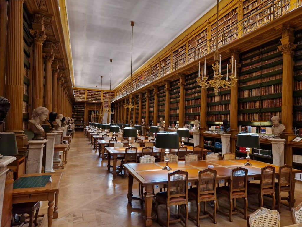 Dans cette très longue galerie, le bois domine de tous côtés, laissant apparaître une partie des 90 000 volumes qu’elle renferme. A son extrémité ouest, une seconde galerie similaire à la première, quoique légèrement plus courte, est exclusivement réservée aux membres de l’Institut.